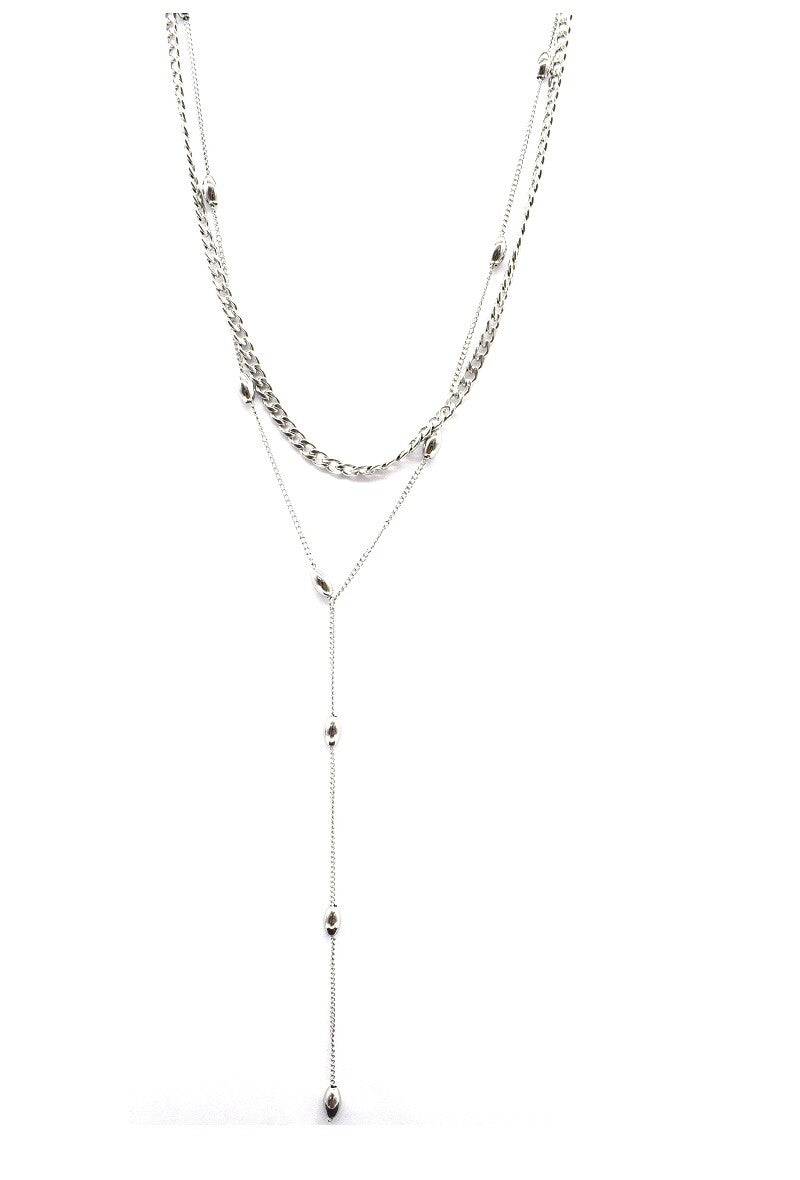 A necklace with a fine and airy line, designed to enhance without overdoing it. Its interplay of silver or gold chains creates a fluid drape that elongates the torso and naturally draws the eye, with softness.